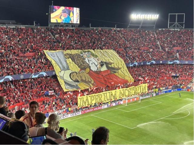 本场塞维球迷继续制造魔鬼般的氛围,赛前集体高唱战歌的声势,甚至压过了现场播放的欧冠主题曲。开场后每当阿森纳球员拿球,现场震耳欲聋的嘘声足以给对手极大的压迫感。在主场球迷声势加持之下,塞维利亚凶狠的中场绞杀和边路压迫让枪手难以打出高质量的进攻,上半场枪手门将拉亚把守的球门恰好处在塞维利亚死忠看台“比里斯”正下方,结果层层叠叠的压迫感导致拉亚数次出球失误。拉莫斯、拉基蒂奇和阿库尼亚组成的塞维利亚左路防区,也限制住了厄德高和萨卡这一路的发挥。